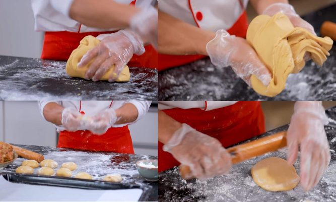 Chú ý hỗn hợp vỏ bột rất dính, do đó bạn luôn phải dải lớp bột phủ trước khi nhào lặn. Khi thấy bột đã mịn, bạn bắt đầu chia nhỏ thành từng phần, mỗi phần 50g rồi vo tròn lại.