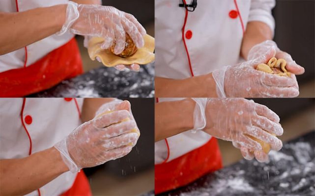 Đặt lớp bột đã lăn ngửa lên bàn tay, sau đó lấy phần nhân cho vào. Bạn bao bọc phần vỏ kín hết nhân và vo tròn lại. Phủ lớp bột phủ xung quanh cho bánh đỡ dính.