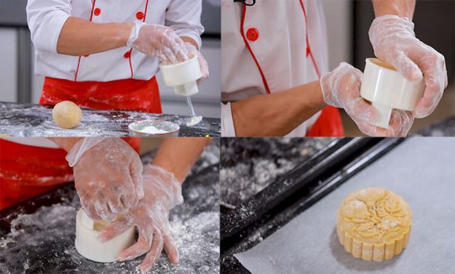 Tiếp theo phủ lớp bột phủ quanh khuôn bánh. Rồi cho phần bánh đã lặn tròn vào. Lấy tay ấn nhẹ nhàng cho bánh dàn đều khuôn. Úp khuôn xuống khay nướng có dải sẵn giấy nến. 1 tay giữ khuôn dưới, 1 tay dấn trục ấn. Dùng lực ấn chặt bánh trong 4-5 giây để bánh được nén đều lực. Sau đó nhả tay ở khuôn dưới ra rồi ấn trục ấn nhẹ nhàng cho bánh rời khuôn.